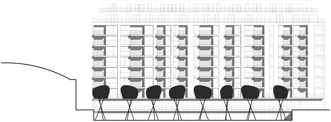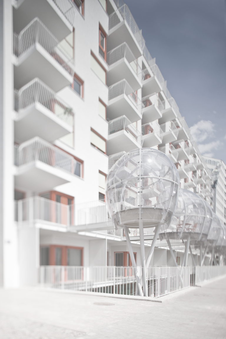 Eine differenzierte Gestaltung zwischen privat und öffentlich der Außenräume der Wohnung anstelle eines schlecht nutzbaren „Abstandsgrüns“ zur Straße. war de Idee dieses Konzepts Das gesamte Gebäude besteht aus 8 Treppenhäusern, Schwimmbad und Folgeeinrichtungen auf dem Dach und einer Garage mit natürlicher Beleuchtung durch die Öffnungen die für die Solitärbäume geplant wurden, die auf Höhe der Garage im Hof versenkt gepflanzt sind.
