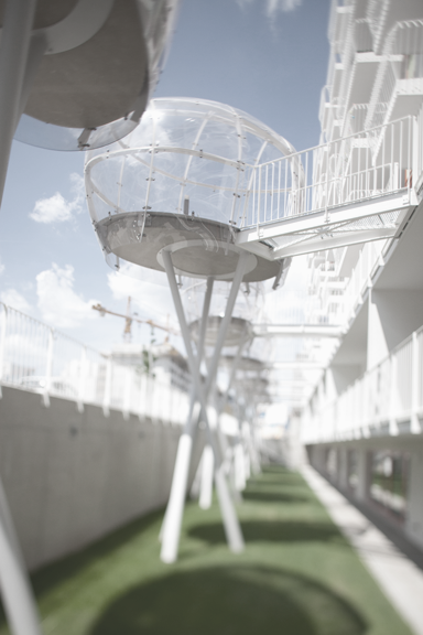 Jede Wohnung verfügt über einen Außenbereich, der zur Hälfte aus einer Loggia und zur Hälfte aus einem Balkon besteht, so dass auf allen Etagen zwischen privat und öffentlich unterschieden werden kann.